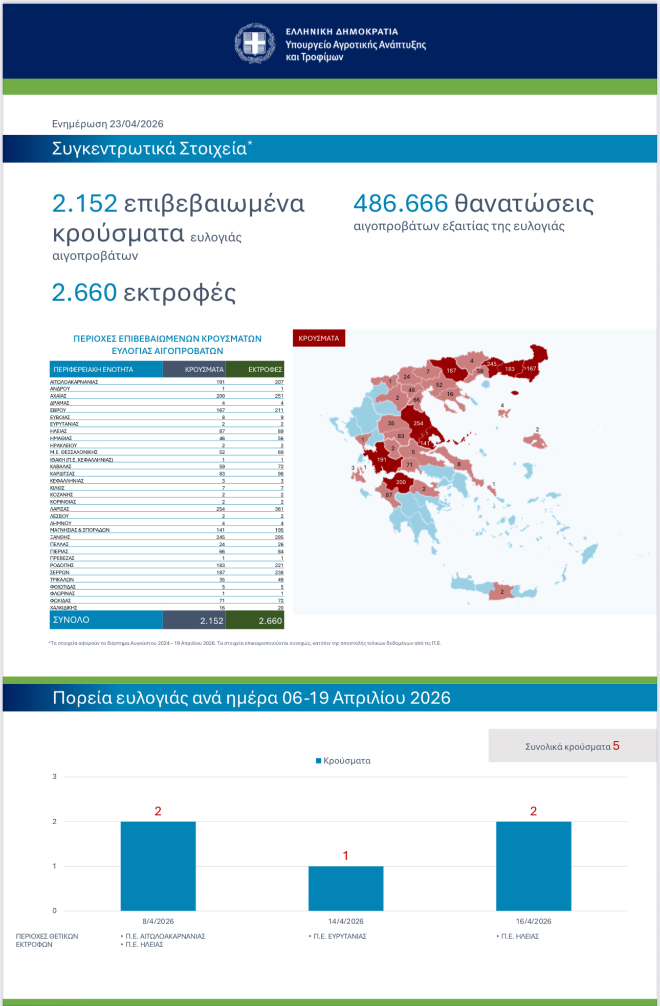 Σύμφωνα με τα επικαιροποιημένα στοιχεία, για το διάστημα από τον Αύγουστο του 2024 έως και τις 19 Απριλίου 2026, έχουν επιβεβαιωθεί συνολικά 2.152 κρούσματα ευλογιάς αιγοπροβάτων, ενώ οι πληγείσες εκτροφές ανέρχονται σε 2.660. Οι συνολικές θανατώσεις αιγοπροβάτων εξαιτίας της νόσου ανέρχονται σε 486.666.