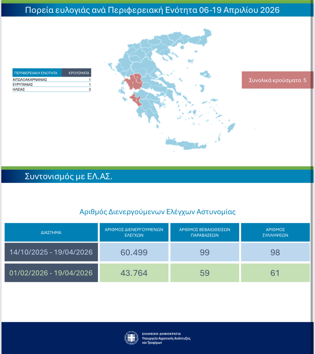 Παράλληλα, συνεχίζονται οι στοχευμένοι έλεγχοι σε συνεργασία με την Ελληνική Αστυνομία. Για το διάστημα από 14/10/2025 έως 19/04/2026 έχουν διενεργηθεί συνολικά 60.499 έλεγχοι, έχουν βεβαιωθεί 99 παραβάσεις και έχουν πραγματοποιηθεί 98 συλλήψεις. Αντίστοιχα, μόνο για το διάστημα από 01/02/2026 έως 19/04/2026, οι έλεγχοι ανήλθαν σε 43.764, οι βεβαιωμένες παραβάσεις σε 59 και οι συλλήψεις σε 61.