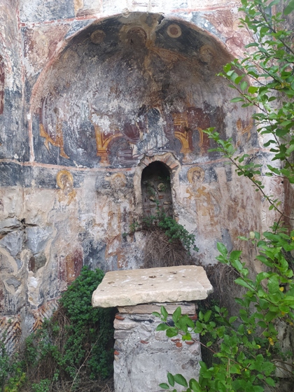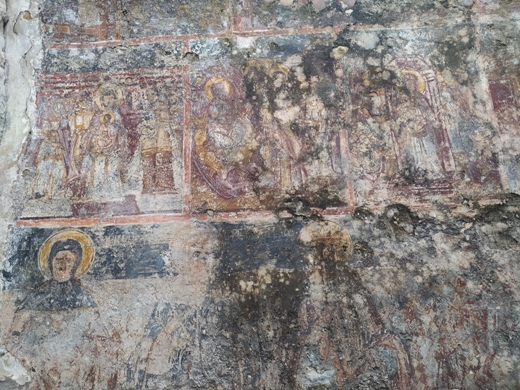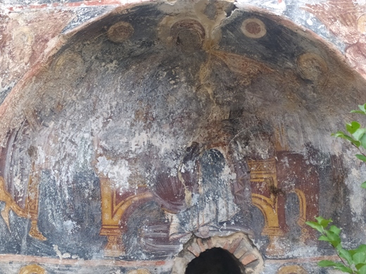 Σε κάπως καλύτερη κατάσταση σώζονται οι τοιχογραφίες που βρίσκονται κάτω από καμάρες και κόγχες. Στη νότια και δυτική πλευρά σώζονται ελάχιστεςτοιχογραφίες.