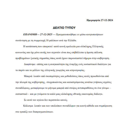 Στην ανακοίνωση που ακολούθησε τη συνάντηση, οι αγρότες τονίζουν ότι τα προβλήματα που έχουν αναδειχθεί δεν αφορούν αποκλειστικά τον αγροτικό κλάδο, αλλά «μια ολόκληρη ελληνική κοινωνία», υπογραμμίζοντας πως πρέπει να τεθούν χωρίς καθυστέρηση όλα τα ζητήματα όπως αυτά έχουν τεθεί προς την κυβέρνηση.