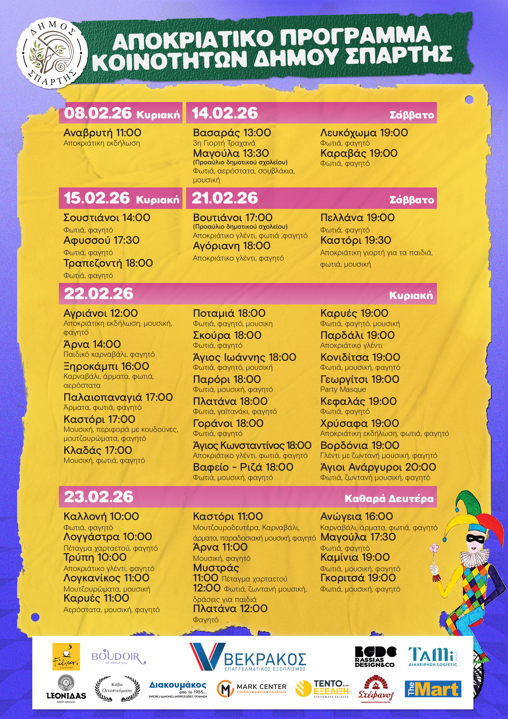 Χορηγοί των αποκριάτικων εκδηλώσεων του Δήμου Σπάρτης είναι οι επιχειρήσεις: Filicori Zecchini, BOUDOIR, ΒΕΚΡΑΚΟΣ, RASSIAS  DESIGN & CO, TAMI Group Διαχείριση Logistic, LEONIΔΑS Food Services, Κάβα Οινοπνεύματα, «Διακουμάκος»Εμπόριο-Διανομές-Αντιπροσωπείες Τροφίμων, MARK CENTER Σχολικά-Βιβλία-Παιχνίδια, ΤΕΝΤΟ ΕΞΕΛΙΞΗ Συστήματα Σκίασης,  «Στέφανος» Παραδοσιακή Αρτοποιεία Σπάρτης, The Mart.