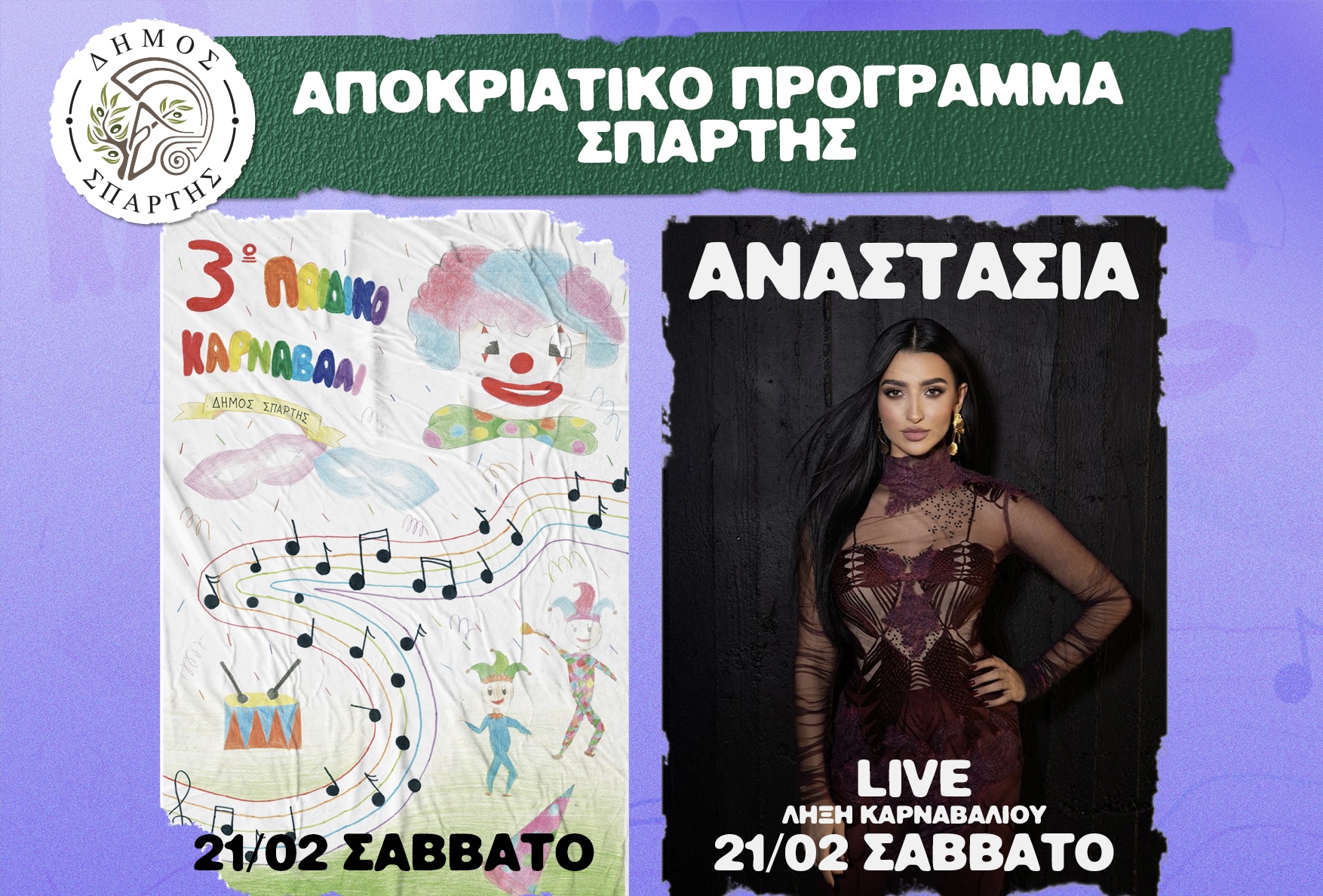 Πλήθος αποκριάτικων εκδηλώσεων θα πλαισιώσουν την Κεντρική Παρέλαση του 3ου Παιδικού Καρναβαλιού, η οποία θα γίνει το Σάββατο 21 Φεβρουαρίου 2026 στις 16:30, ενώ αμέσως μετά η Αναστασία υπόσχεται να μας ξεσηκώσει με μια μοναδική μουσική συναυλία.