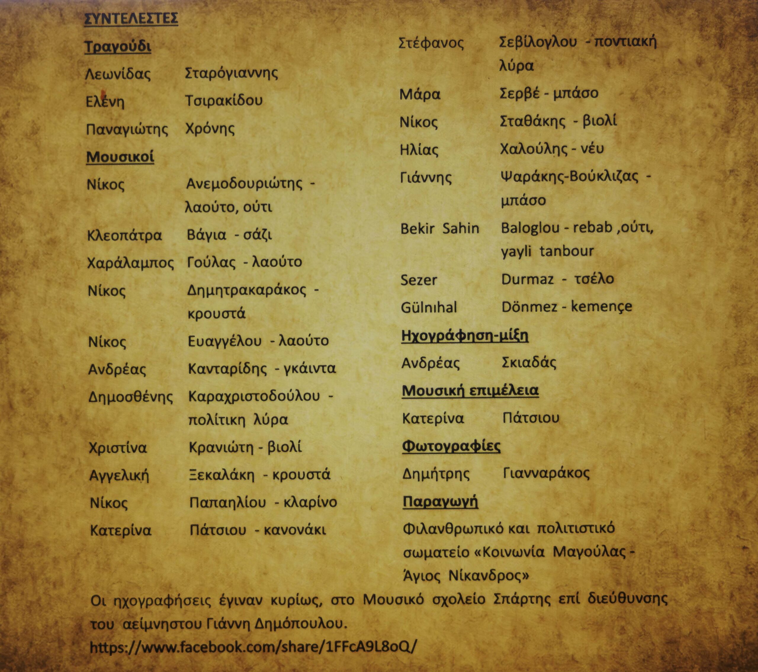 Είκοσι δύο μουσικοί από διάφορες περιοχές της Ελλάδας και από την Κωνσταντινούπολη, συναντιούνται σε αυτή την ηχογράφηση, ο καθένας προσφέροντας το προσωπικό του αποτύπωμα, τη φωνή και την ψυχή του, πλέκοντας μαζί έναν κοινό ήχο.