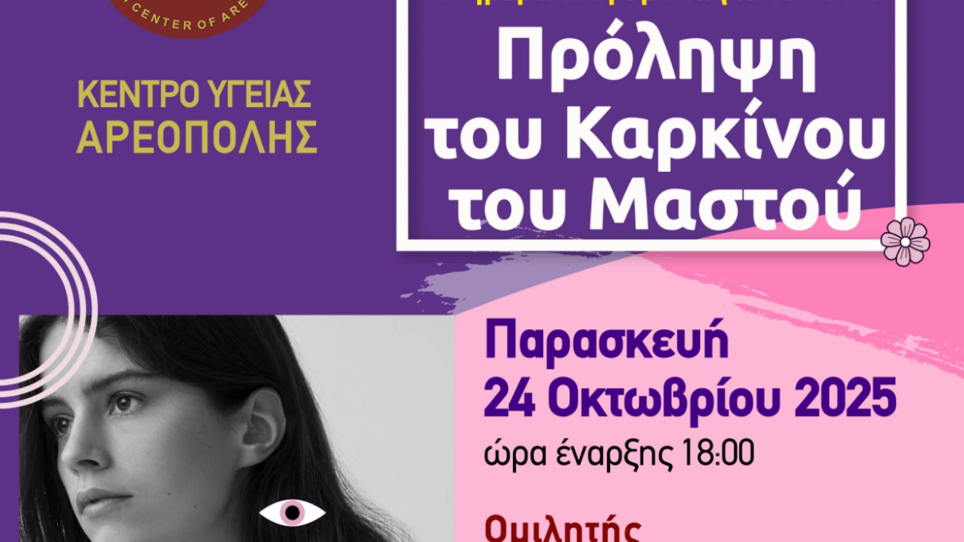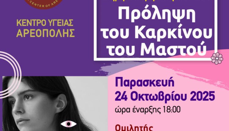 Το Κέντρο Υγείας Αρεόπολης προσκαλεί τις γυναίκες της Μάνης και κάθε ενδιαφερόμενο πολίτη στην ενημερωτική ομιλία για την πρόληψη του καρκίνου του μαστού, η οποία θα πραγματοποιηθεί την Παρασκευή 24 Οκτωβρίου και ώρα 18:00 στο χώρο του Κέντρου Υγείας.