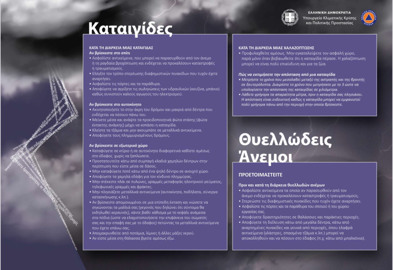 Για περισσότερες πληροφορίες και οδηγίες αυτοπροστασίας από τα έντονα καιρικά φαινόμενα, οι πολίτες μπορούν να επισκεφθούν την ιστοσελίδα της Γενικής Γραμματείας Πολιτικής Προστασίας στην ηλεκτρονική διεύθυνση civilprotection.gov.gr.