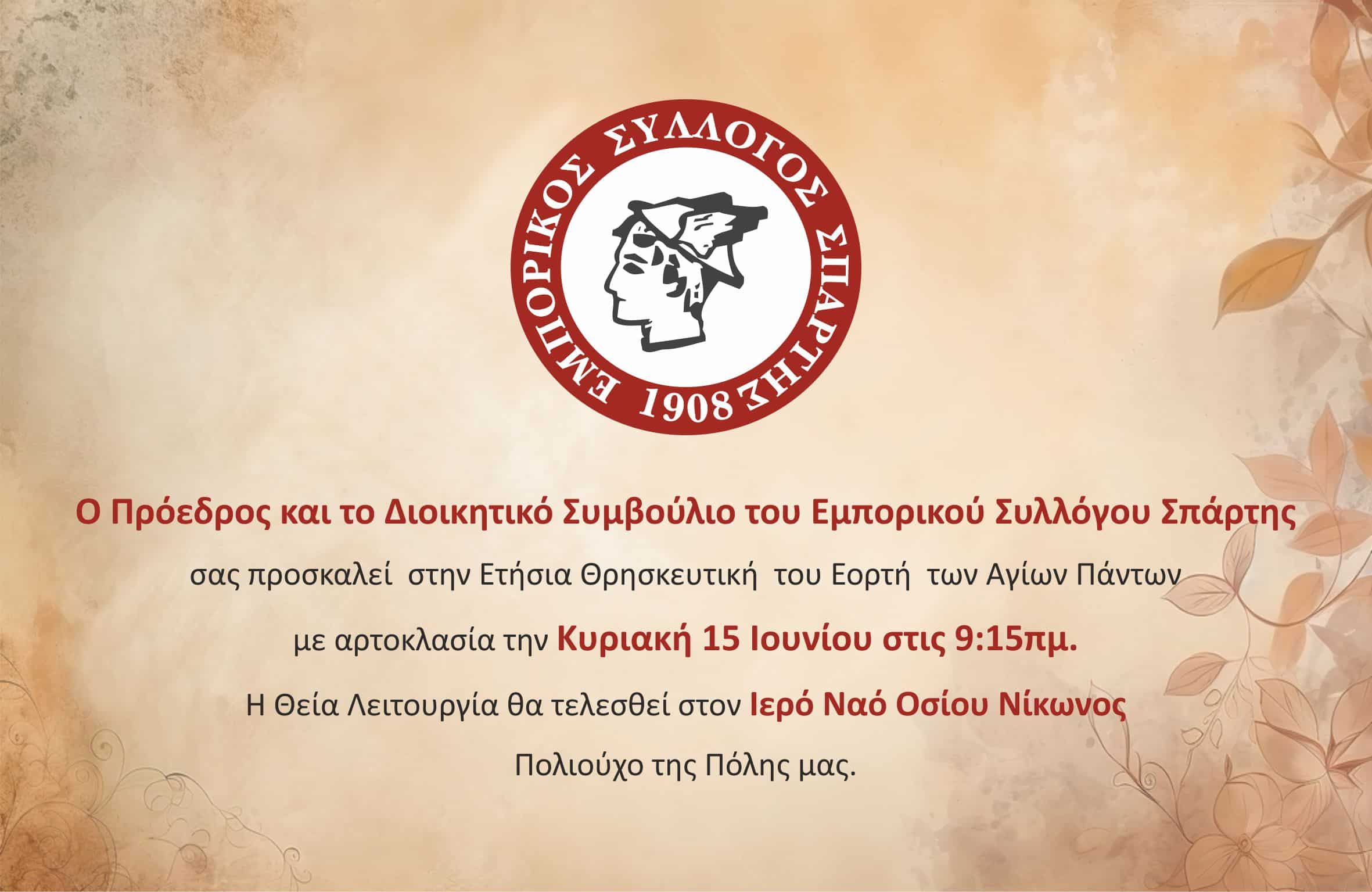 Σας προσκαλούμε στην Ετήσια Θρησκευτική Εορτή του Συλλόγου την Κυριακή 15 Ιουνίου των Αγίων Πάντων και ώρα 9:15 πμ. Η θεία Λειτουργία θα τελεσθεί στον Ιερό Ναό Οσίου Νίκωνος, Πολιούχου της Σπάρτης.