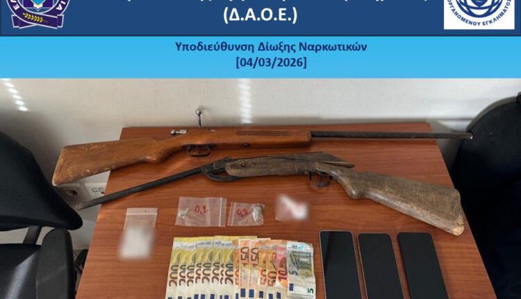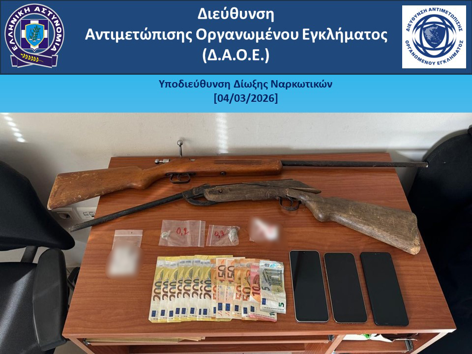 Κατασχέθηκαν, μεταξύ άλλων, -4,7- γραμμάρια ακατέργαστης κάνναβης, -6- ναρκωτικά δισκία, -2- αεροβόλα τυφέκια και το χρηματικό ποσό των -1.865- ευρώ