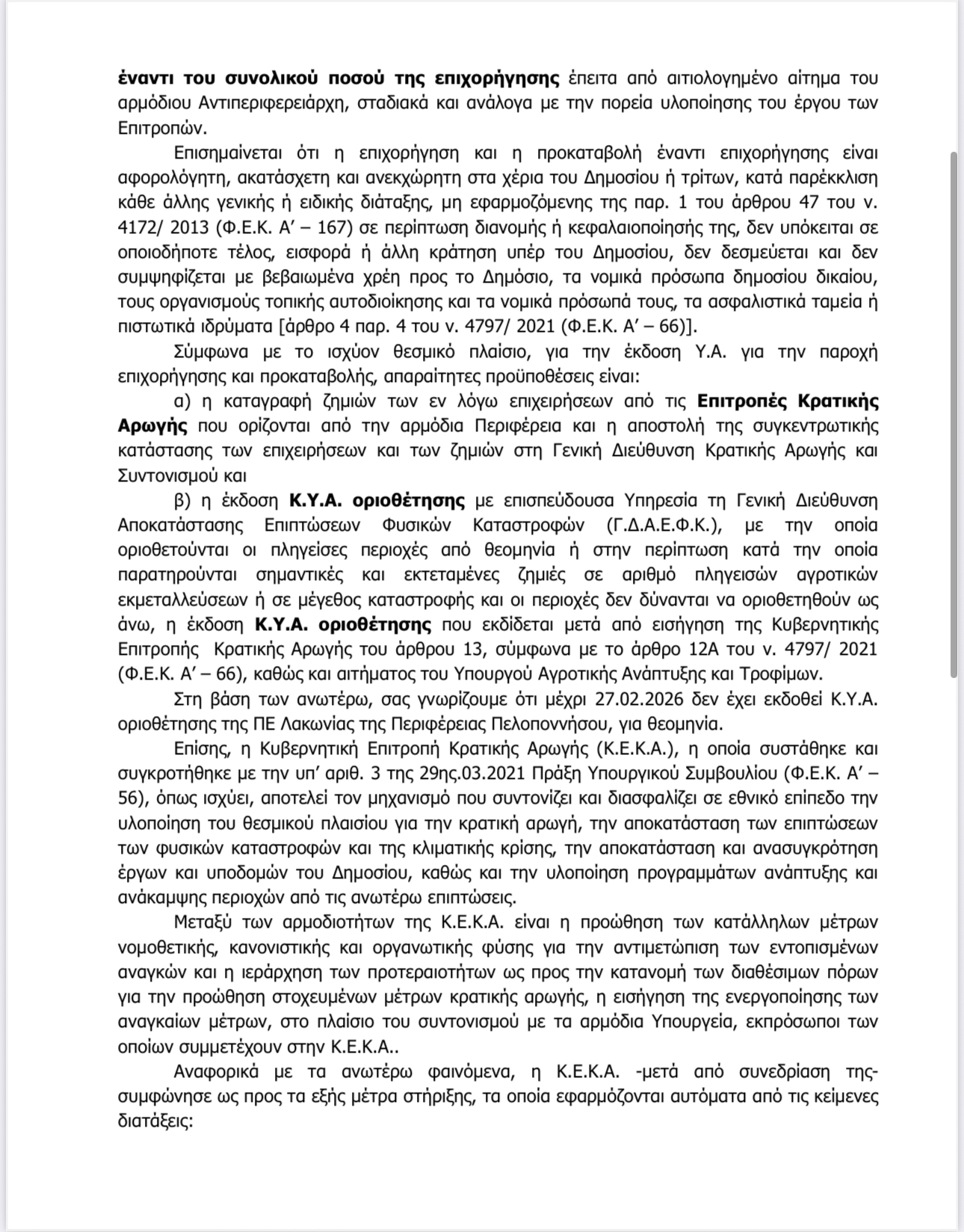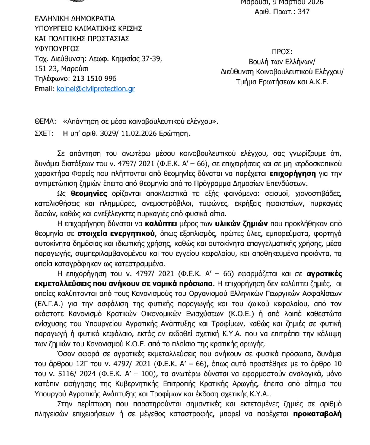 Από την απάντηση του Υπουργείου προκύπτει ότι, σχεδόν τρεις μήνες μετά τις πλημμύρες της 4ης Δεκεμβρίου 2025 που προκάλεσαν εκτεταμένες ζημιές σε κατοικίες, επιχειρήσεις και αγροτικές εκμεταλλεύσεις στους Δήμους Ανατολικής Μάνης και Ευρώτα, η βασική διαδικασία ενεργοποίησης της κρατικής αρωγής δεν έχει ακόμη ολοκληρωθεί. Συγκεκριμένα, το ίδιο το Υπουργείο αναφέρει ότι μέχρι τις 27 Φεβρουαρίου 2026 δεν έχει εκδοθεί η απαραίτητη Κοινή Υπουργική Απόφαση οριοθέτησης των πληγεισών περιοχών της Περιφερειακής Ενότητας Λακωνίας και ότι η διαδικασία βρίσκεται ακόμη σε εξέλιξη.