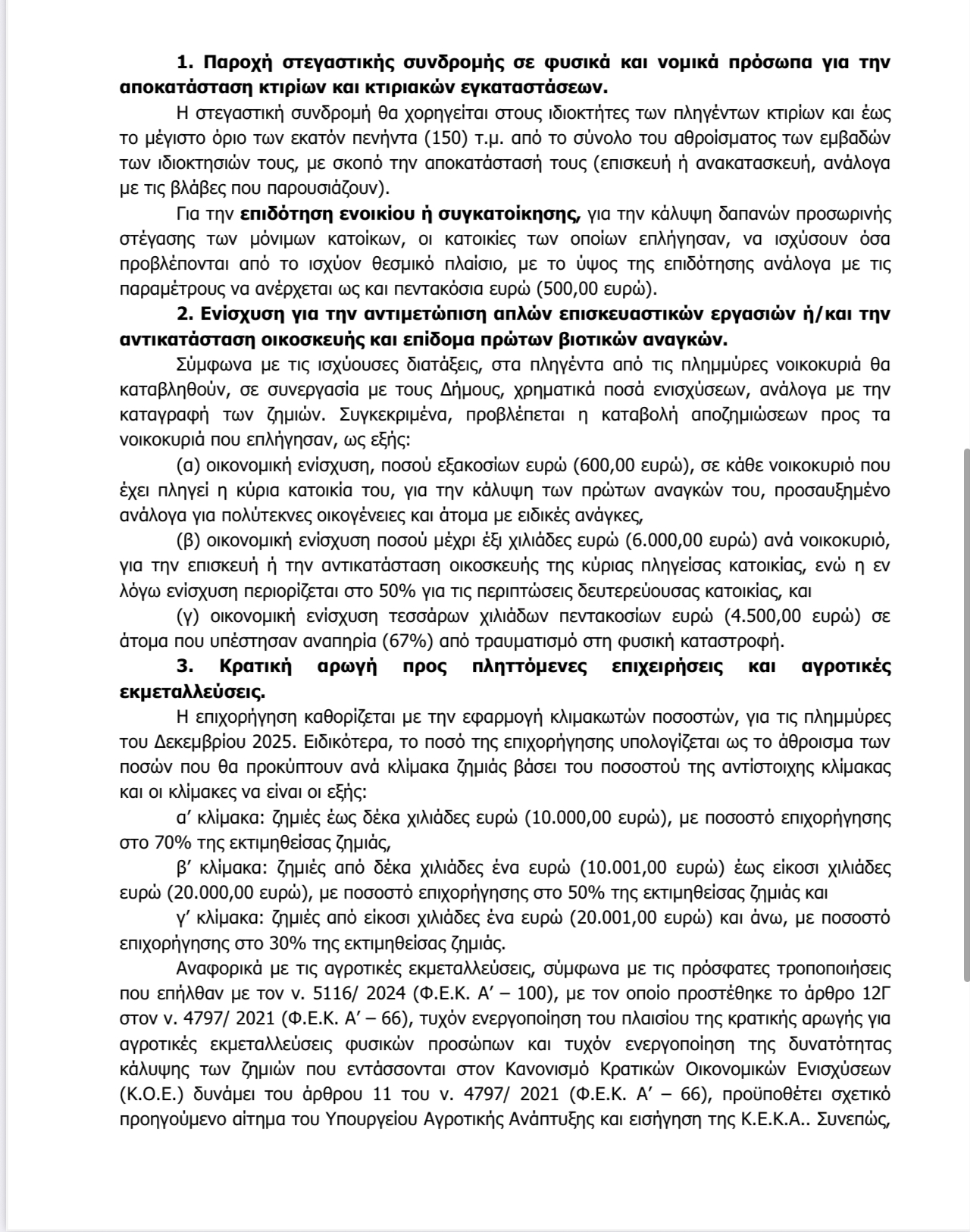Την ίδια στιγμή, η μη ολοκλήρωση της οριοθέτησης των πληγεισών περιοχών καθυστερεί την πλήρη ενεργοποίηση βασικών μέτρων αποζημίωσης. Μεταξύ αυτών περιλαμβάνονται η στεγαστική συνδρομή για την επισκευή ή ανακατασκευή κτιρίων, η πλήρης εφαρμογή της κρατικής αρωγής για επιχειρήσεις καθώς και η ενεργοποίηση ενισχύσεων για αγροτικές εκμεταλλεύσεις, οι οποίες προϋποθέτουν επιπλέον διαδικασίες και σχετικές εισηγήσεις. Για τις επιχειρήσεις ειδικότερα προβλέπεται επιχορήγηση με κλιμακωτά ποσοστά, που ανέρχονται στο 70% για ζημιές έως 10.000 ευρώ, στο 50% για ζημιές από 10.001 έως 20.000 ευρώ και στο 30% για ζημιές άνω των 20.001 ευρώ, ωστόσο η εφαρμογή του μέτρου προϋποθέτει την ολοκλήρωση των απαραίτητων διοικητικών πράξεων.