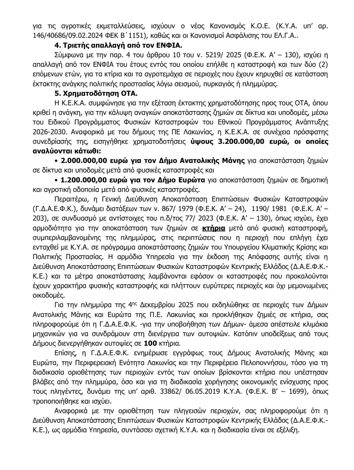 Στην απάντηση αναφέρεται επίσης ότι προβλέπεται απαλλαγή από τον ΕΝΦΙΑ για το έτος της καταστροφής και για τα δύο επόμενα έτη για ακίνητα σε περιοχές που επλήγησαν από πλημμύρες και έχουν κηρυχθεί σε κατάσταση έκτακτης ανάγκης πολιτικής προστασίας, μέτρο το οποίο συνδέεται με τη διαδικασία καταγραφής και οριοθέτησης των πληγεισών περιοχών.