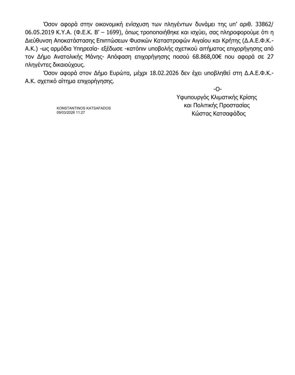 Σύμφωνα με την απάντηση του Υπουργείου, μέχρι σήμερα έχει εγκριθεί οικονομική ενίσχυση συνολικού ύψους 68.868 ευρώ που αφορά 27 πληγέντες στον Δήμο Ανατολικής Μάνης, κατόπιν σχετικού αιτήματος του Δήμου.
