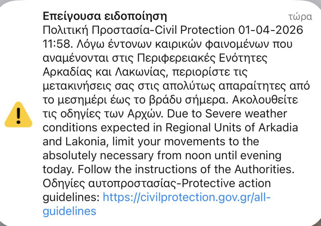 Σαρώνει τη χώρα η κακοκαιρία Erminio, με τους κατοίκους σε Αρκαδία, Λακωνία, Αργολίδα και Κορινθία να λαμβάνουν μήνυμα από το 112 για περιορισμό των μετακινήσεων.
