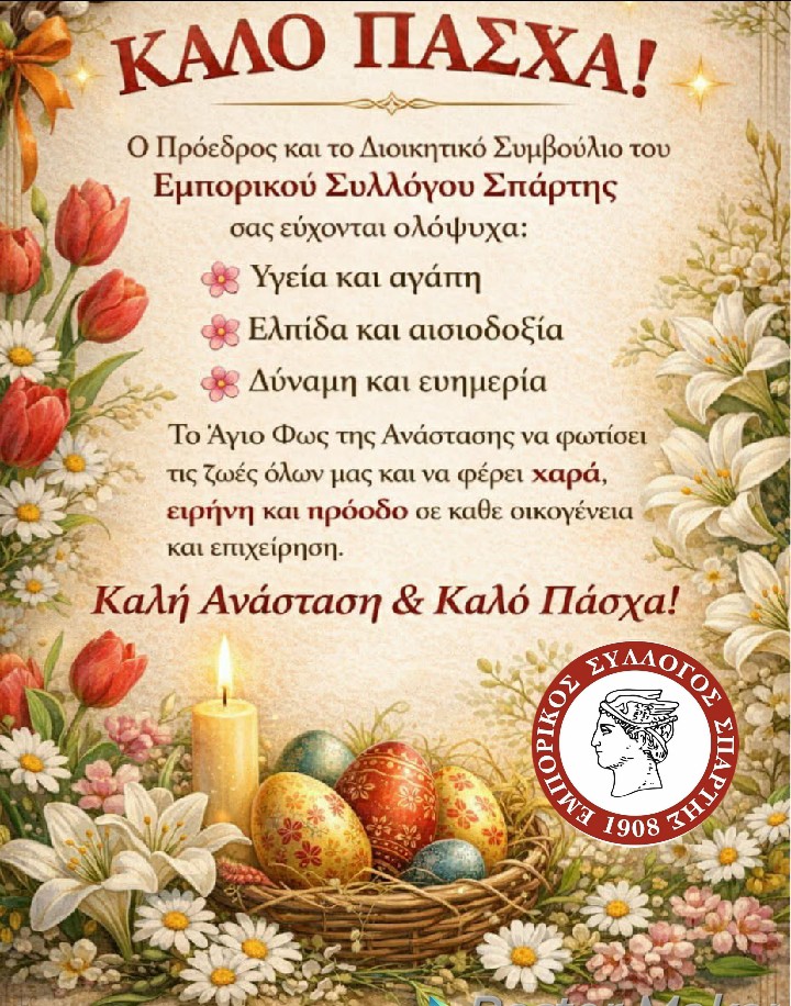 Ο Πρόεδρος και το Διοικητικό Συμβούλιο του Εμπορικού Συλλόγου Σπάρτης σας εύχονται ολόθερμα η Ανάσταση του Κυρίου να φέρει στις οικογένειες σας Υγεία, Αγάπη, Ειρήνη, Ευτυχία, Ευημερία και να γεμίσει τις ψυχές όλων μας με Ελπίδα, Δύναμη και Αισιοδοξία.