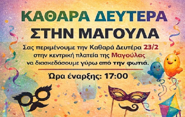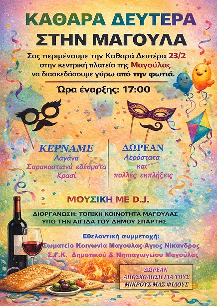 Η Τοπική Κοινότητα Μαγούλας και ο Δήμος Σπάρτης σας προσκαλούν την Καθαρά Δευτέρα 23 Φεβρουαρίου από τις 17:00 και μετά στην κεντρική πλατεία της Μαγούλας σε μια αποκριάτικη εκδήλωση γεμάτη χορό διασκέδαση και πολλές εκπλήξεις γύρω από την φωτιά.