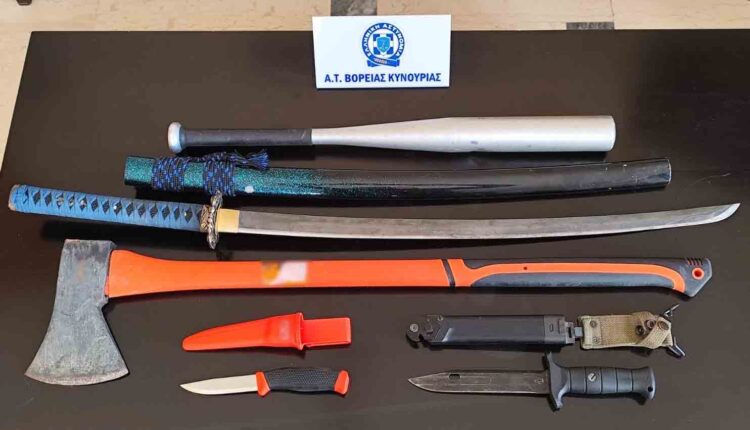 1 ρόπαλο, -1- σπαθί τύπου «κατάνα», συνολικού μήκους -1,03- μέτρων, -1- μαχαίρι στρατιωτικού τύπου, συνολικού μήκους -31- εκατοστών και -1- μαχαίρι, συνολικού μήκους -20- εκατοστών, στην Αρκαδία και