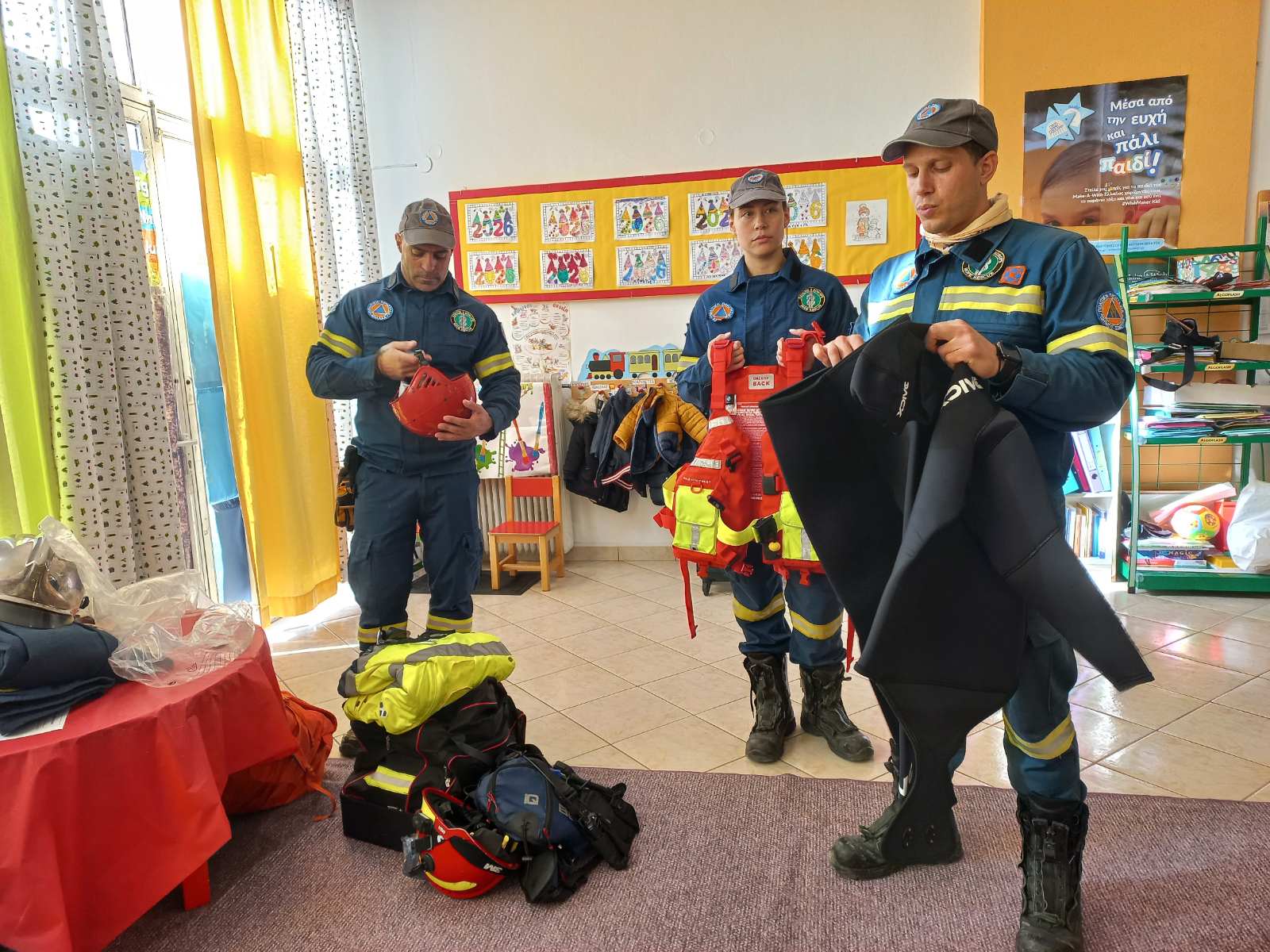 Ειδικότερα, ενημέρωσαν τους μικρούς μαθητές για το πώς πρέπει να αντιδρούμε όταν έρθουμε αντιμέτωποι με ένα τέτοιο φαινόμενο και τους έδειξαν τον βασικό εξοπλισμό που χρησιμοποιεί η Πολιτική Προστασία, όπως το ντρόουν, το οποίο μεταδίδει απευθείας εικόνα από τις περιοχές ενός συμβάντος στο Επιχειρησιακό Κέντρο της Πολιτικής Προστασίας του Δήμου, τον εξοπλισμό τεχνικής διάσωσης, καθώς και τον εξοπλισμό διάσωσης σε ορμητικά νερά (ειδικές στολές, σωσίβια, κράνη κ.λπ.). Ενθουσιασμένα τα παιδιά είδαν από κοντά και άγγιξαν τον εξοπλισμό, ενώ συμμετείχαν και σε επίδειξη ρίψης νερού.