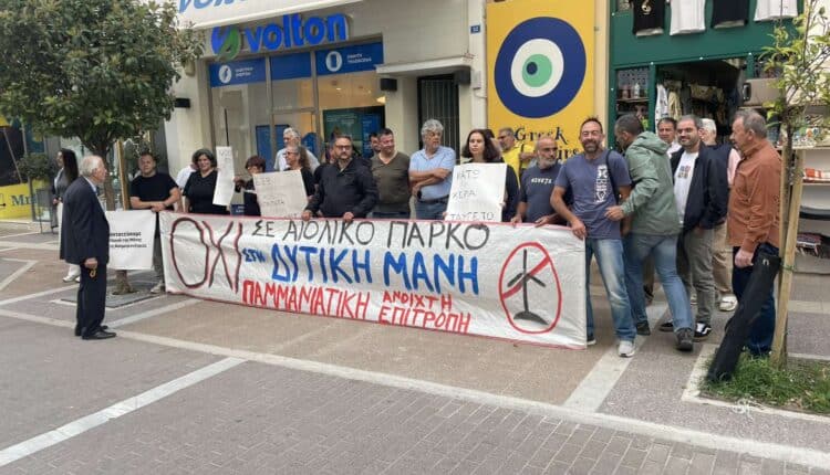 Η περιβαλλοντική συμμαχία «Σώστε τα Βουνά της Μάνης», μαζί με την «Παμμανιάτικη Ανοιχτή Επιτροπή Αγώνα Κατά των Ανεμογεννητριών στη Μάνη», οργάνωσαν την Παρασκευή 30 Μαΐου διαμαρτυρία έξω από το κατάστημα της