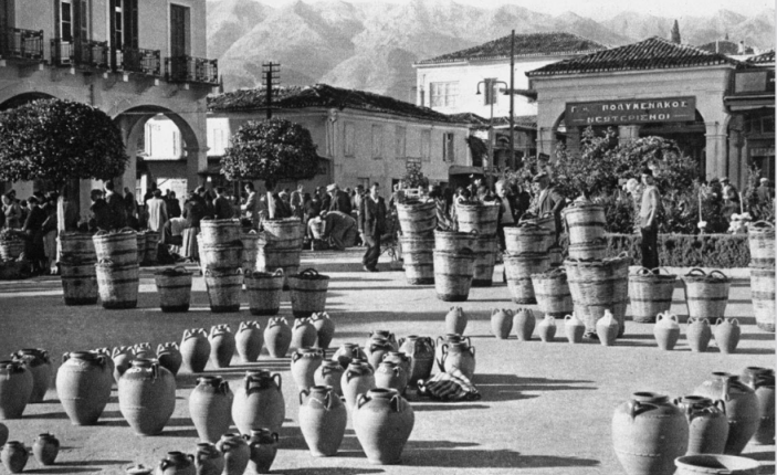 Πάνω στην πλατεία, στο κέντρο της, «εθιμικώ δικαίω», εκτίθονταν, παραταγμένα σαν στρατιωτάκια, κατά μέγεθος, τα «πήλινα» των Αφών Μαγγαλούση, τα οποίακατασκεύαζαν και «έψηναν» στο εργαστήριό τους, στη γωνία Παλαιολόγου και Μενελάου: Βυτινάρες μικρές και μεγάλες, για λάδι, κρασί, ελιές, παστό χοιρινό κ.α., γλάστρες για να βάζουν οι νοικοκυρές τα βασιλικά και τα λουλούδια τους και βίκες για να δροσερεύει και να νοστιμεύει το νερό, κατά το καλοκαίρι, τότε που δεν υπήρχαν, ακόμα, ψυγεία.