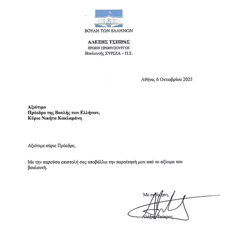Με μια λιτή επιστολή του προς τον πρόεδρο της Βουλής Νικήτα Κακλαμάνη, ο Αλέξης Τσίπρας ανακοίνωσε την παραίτησή του από το αξίωμα του βουλευτή, ανοίγοντας τον δρόμο για τις επόμενες κινήσεις του, καθώς όλα δείχνουν ότι το επόμενο διάστημα επίκειται η ανακοίνωση δημιουργίας νέου πολιτικού σχηματισμού από τον πρώην πρωθυπουργό.