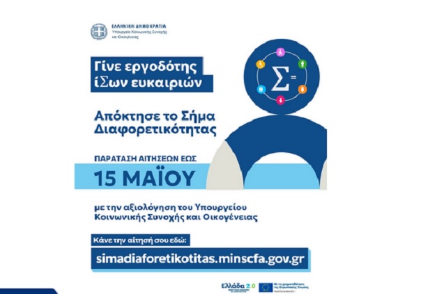 Παρατείνεται η προθεσμία υποβολής αιτήσεων για το πρόγραμμα «Σήμα Διαφορετικότητας», με απόφαση του Υπουργείου Κοινωνικής Συνοχής και Οικογένειας εως την Παρασκευή  15 Μαΐου 2026