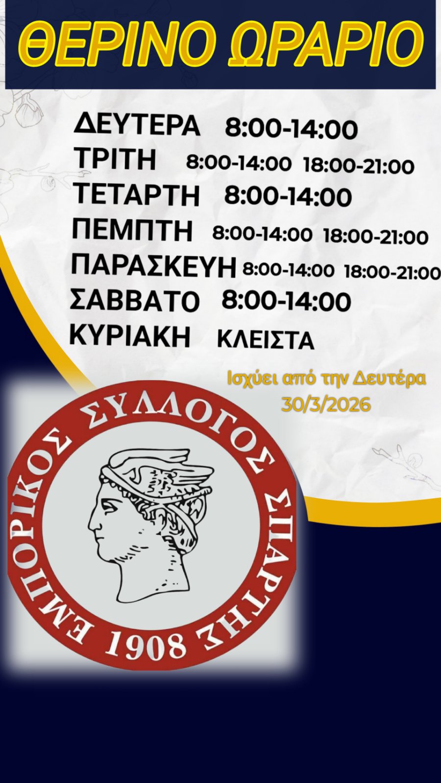 Από την προσεχή Δευτέρα 30 Μαρτίου 2026, με την έλευση της θερινής ώρας, τίθεται σε ισχύ και το θερινό ωράριο λειτουργίας των καταστημάτων. Ο Πρόεδρος Καρβουνιάρης Ιωάννης Η Γ.Γραμματέας Κρικέλα Παναγιώτα Share FacebookTwitterWhatsAppViber