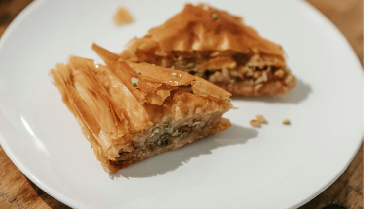 3. Με ένα κοφτερό μαχαίρι, χαράζετε το γλυκό σε μπακλαβωτά κομμάτια και καρφώνετε στο μέσο κάθε κομματιού από 1 γαριφαλάκι. Ζεσταίνετε καλά το βούτυρο που έμεινε και “ζεματάτε” τα κομμάτια του μπακλαβά.